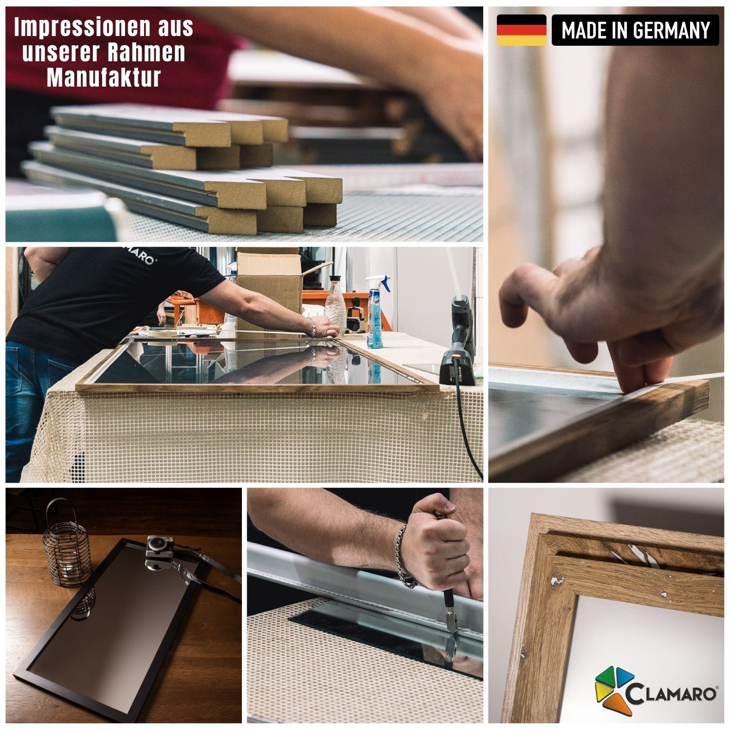 Alle Clamaro Wandbilderrahmen werden auf Bestellung in unserer Bilderrahmen Manufaktur einzeln und individuell von Hand in Ihrem Wunschmaß hergestellt. Präzision und Qualität zu 100% Made in Germany