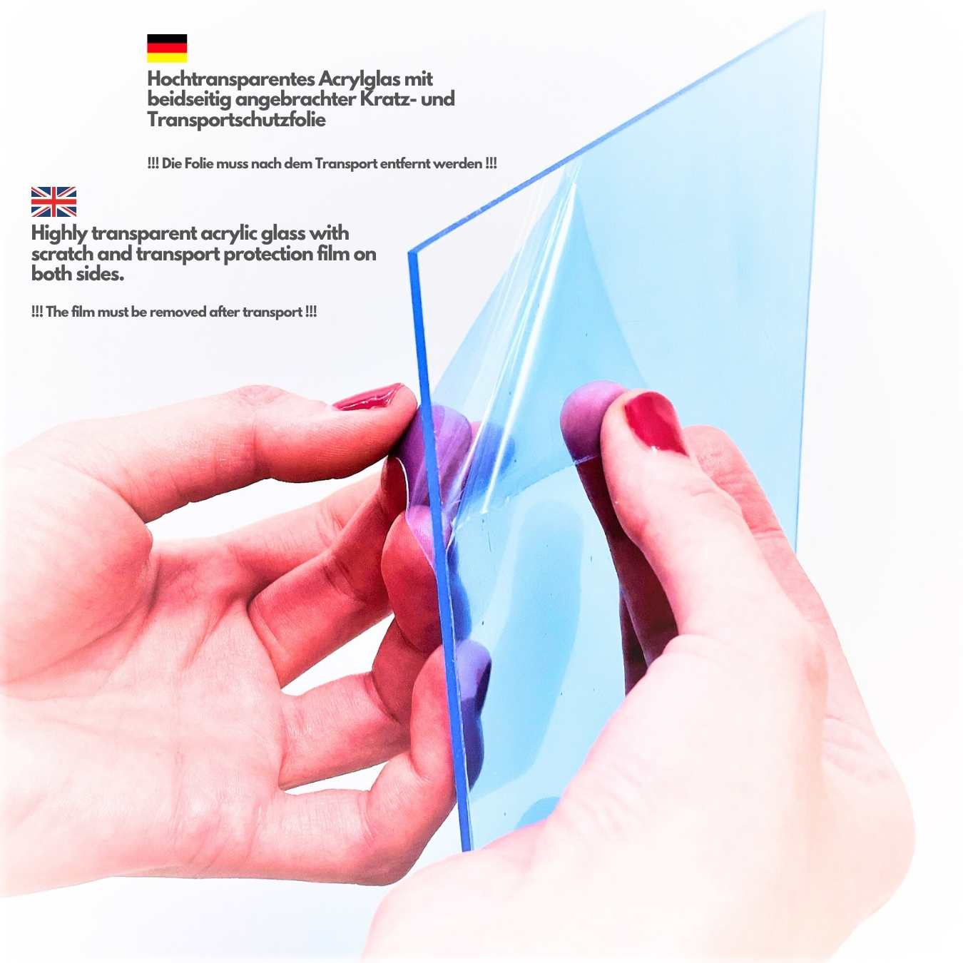 SICHER BEIM TRANSPORT Die Kunstglasscheibe ist beidseitig mit einer hauchdünnen, kaum sichtbaren Kratzschutzfolie überzogen. Bitte entfernen Sie diese nach dem Transport.